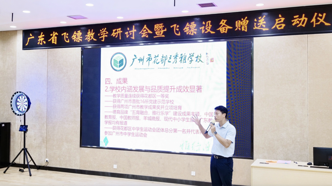广州市花都区秀雅学校副校长宋文杰在研讨会上分享飞镖教学心得。