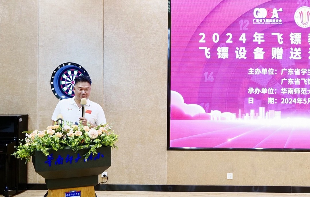 广东省飞镖运动协会秘书长吴俊鹏介绍全省飞镖进校园情况。