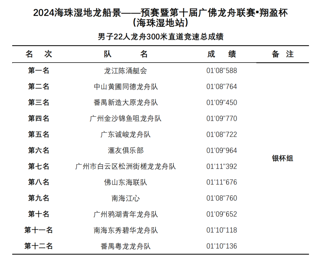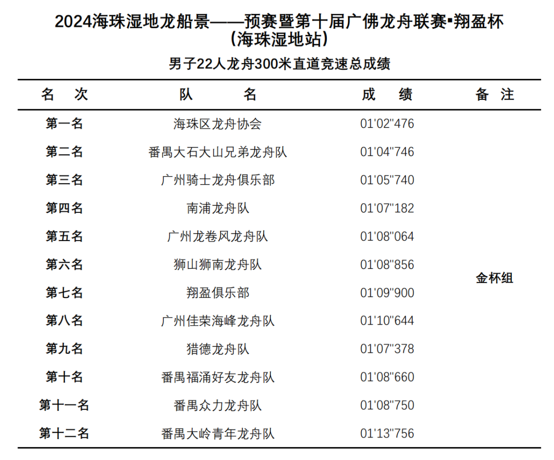 本次预赛不仅吸引了来自广州、佛山、中山、东莞等地的36支龙舟队伍,还有2023年广州国际龙舟邀请赛的冠军队伍参与角逐。预赛采用了晋级制,经过预赛、复赛、半决赛的层层选拔,最终有12支金杯组的龙舟队伍脱颖而出,获得参加2024年海珠湿地龙船景公开赛的资格。