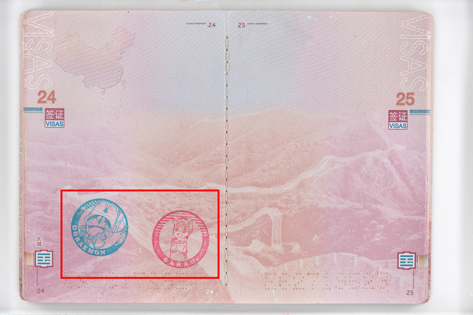 当天,来自江西的刘女士准备从昆明长水国际机场出发前往泰国旅游时,昆明边检站民警在刘女士的护照签证页内发现盖着一对整整齐齐的“哆啦A梦”印章,连边检民警都惊诧于该对印章深谙边检验讫章“出入成对”的原理。刘女士称,她平常都将护照随手放在抽屉里,直到办理此次出境手续时才发现有了这对印章,猜想大概是孩子将护照当成了儿童“手账本”,在上面“大显身手”。