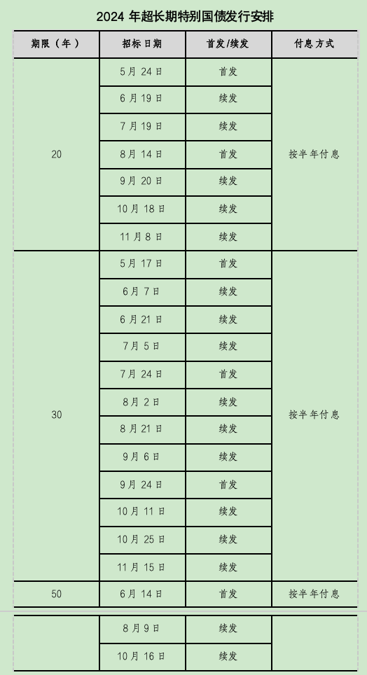 今日(5月13日),财政部发布《2024年一般国债、超长期特别国债发行有关安排》,其中超长期特别国债涉及期限为20年、30年、50年,决定5月17日发行30年超长期特别国债,决定5月24日发行20年超长期特别国债,决定6月14日发行50年超长期特别国债。