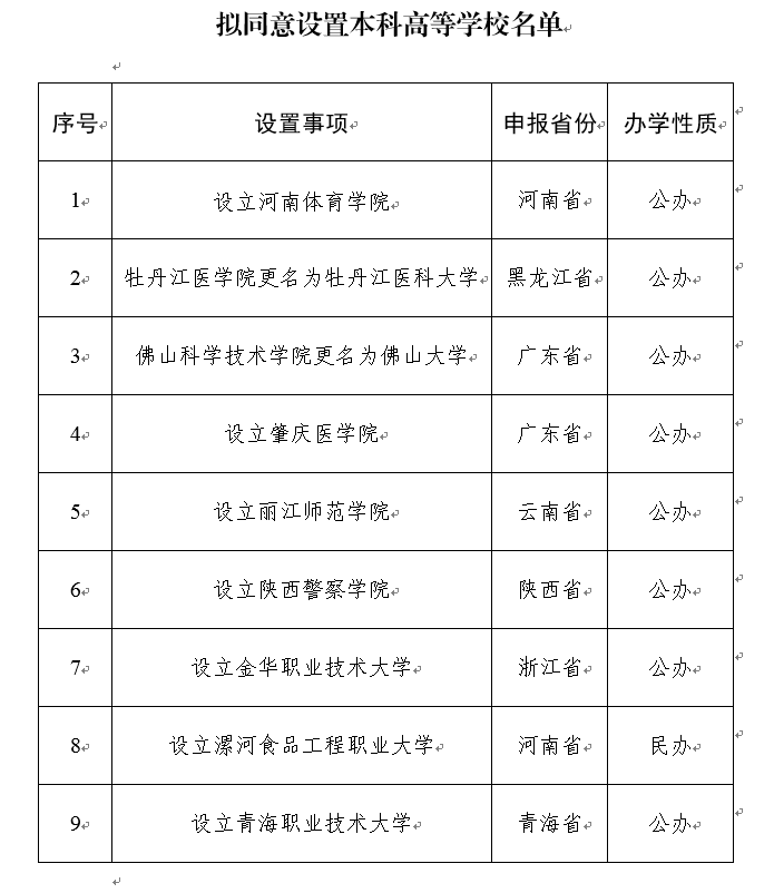 5月13日,教育部发布《关于拟同意设置本科高等学校的公示》,根据《中华人民共和国高等教育法》《普通高等学校设置暂行条例》《普通本科学校设置暂行规定》《本科层次职业学校设置标准(试行)》等有关规定以及第八届全国高等学校设置评议委员会考察评议结果,经教育部党组会议审议,拟同意设置河南体育学院等9所学校。