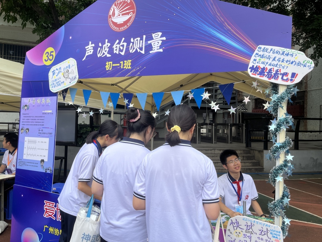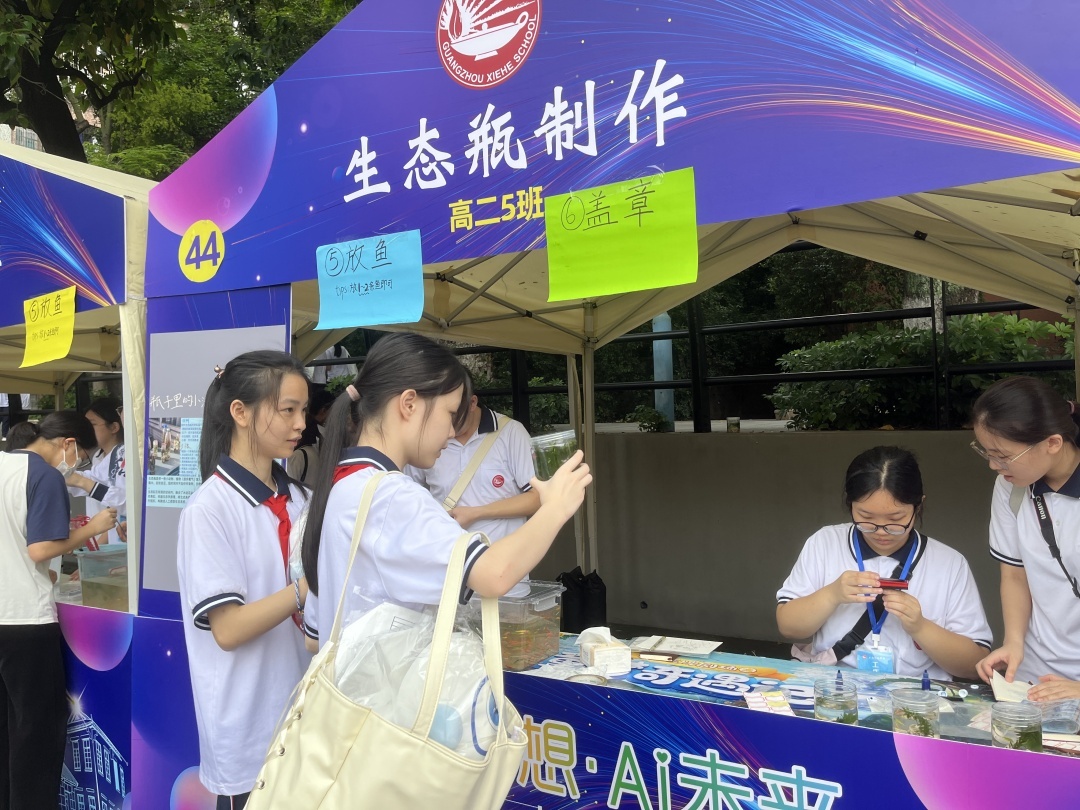 科技博览会中,各年级各班支起摊位,展示生态瓶制作、微纳流控芯片展示、心电图测量、声波测量等各式各样的科技项目,不同同学前去互动体验,感受科技和学科世界的奇妙。