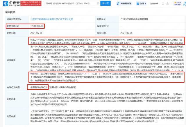 据企查查APP显示,近日,北京花千树信息科技有限公司广州天河分公司因虚假宣传违法行为,被广州市天河区市场监督管理局罚款150万元。