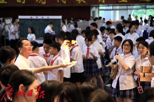 老师在活动上演示“手掌冒火”,吸引同学关注。
