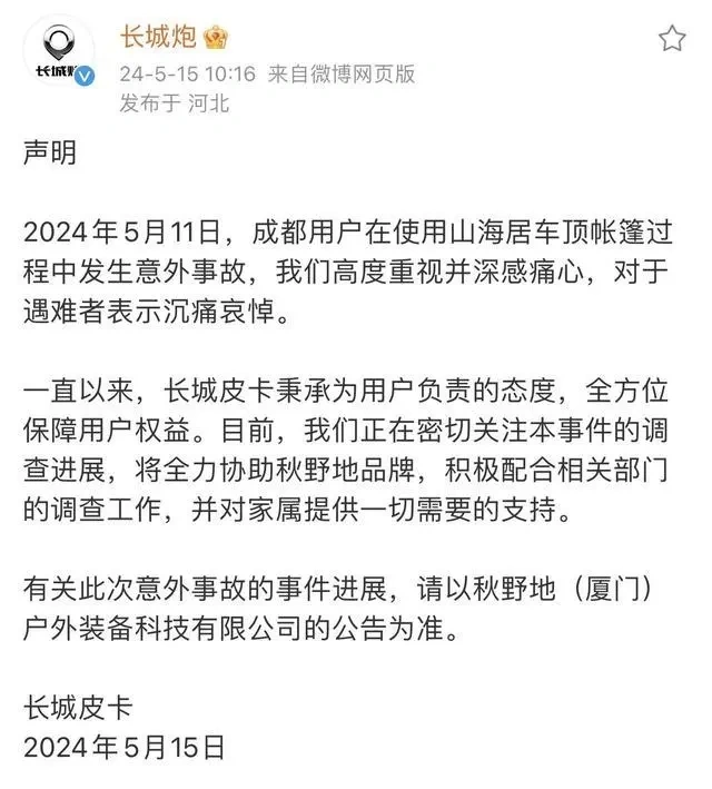5月15日,长城汽车旗下官方微博@长城炮 发布声明称:“5月11日,成都用户在使用山海居车顶帐篷过程中发生意外事故,我们高度重视并深感痛心,对于遇难者表示沉痛哀悼。目前,我们正在密切关注本事件的调查进展,将全力协助秋野地品牌,积极配合相关部门的调查工作,并对家属提供一切需要的支持。有关此次意外事故的事件进展,请以秋野地(厦门)户外装备科技有限公司的公告为准。”