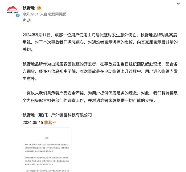 秋野地(厦门)户外装备科技有限公司官方微博@秋野地 则发布声明称:“秋野地品牌作为山海居露营帐篷的开发者,在事故发生当日组织团队赶赴现场,配合各方调查,经多方信息初步了解,本次事故是在电动帐篷上升过程中,用户进入帐篷内发生意外。我们将持续尽全力积极配合相关部门的调查工作,并对遇难者家属提供一切可能的支持。”
