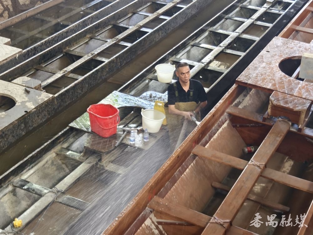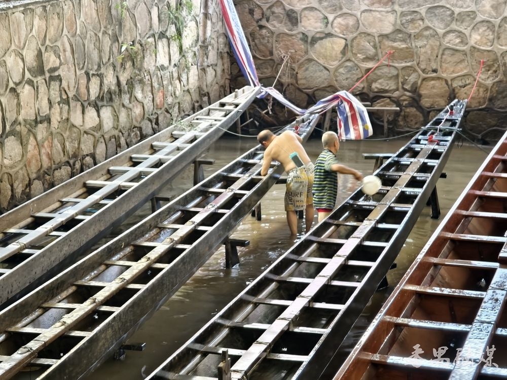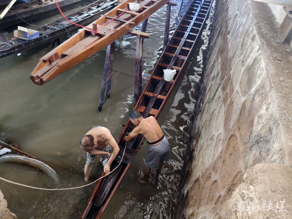 村民在龙船坞擦洗龙舟