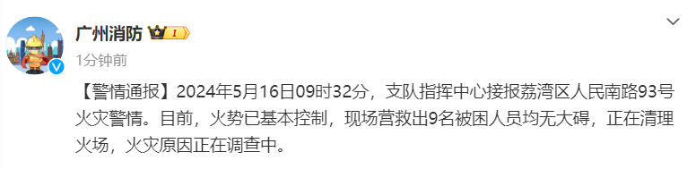据广州消防通报,2024年5月16日09时32分,支队指挥中心接报荔湾区人民南路93号火灾警情,支队立即调派消防救援力量赶赴现场处置,11时40分,明火扑灭。现场搜救出1名人员(确认为之前失联人员),经医疗救护人员确认已无生命体征。火灾原因正在调查中。