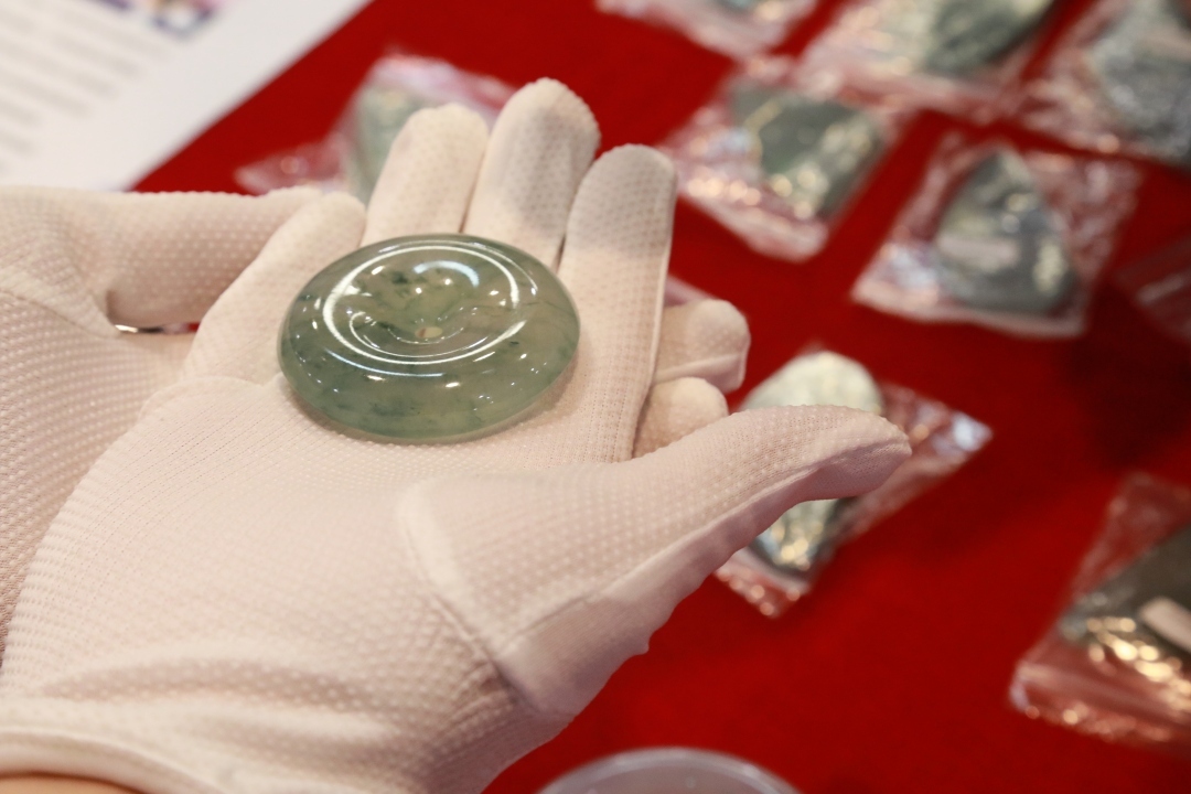 在通报会现场,几块大大小小、其貌不扬的石头引人围观。从外观上看,它们与普通石头并无显著差异,但强光手电打上去后,石头却呈现出青碧色,民警介绍,这是玉石原料。今年4月,经侦经警联合海关部门在桂城街道破获一宗走私玉石原料案,抓获嫌疑人5名,查获绿辉石等玉石料20余吨,涉案价值超270万元,有力维护南海玉器市场的营商环境。