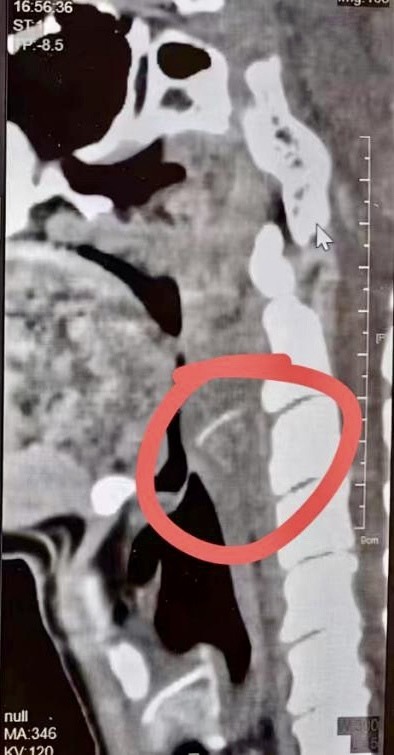 王先生说,鱼刺卡喉一周后曾通过喉镜探查,却并未发现踪影,再过三天后通过颈部CT检查才在咽后壁发现异常高密度影像,表明鱼刺已深入喉咙“潜伏”,并在局部引发脓肿。