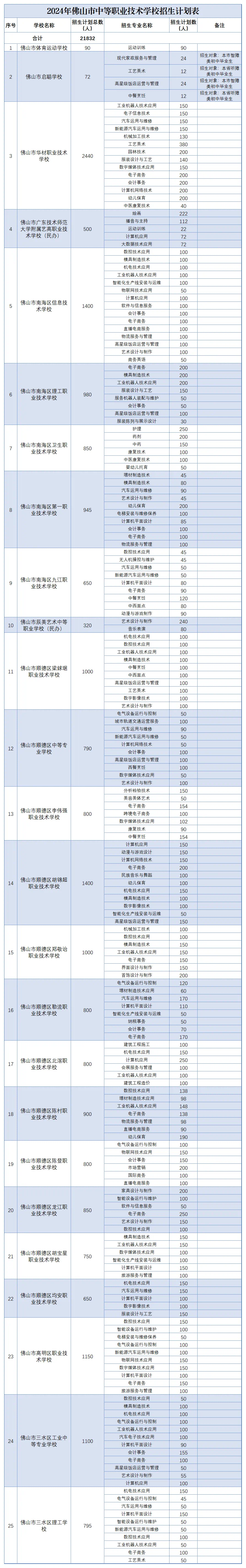 2024年佛山全市中等职业学校(不含技工院校)招生计划21832人,其中公办中职学校招生计划21012人,民办中职学校招生计划820人。