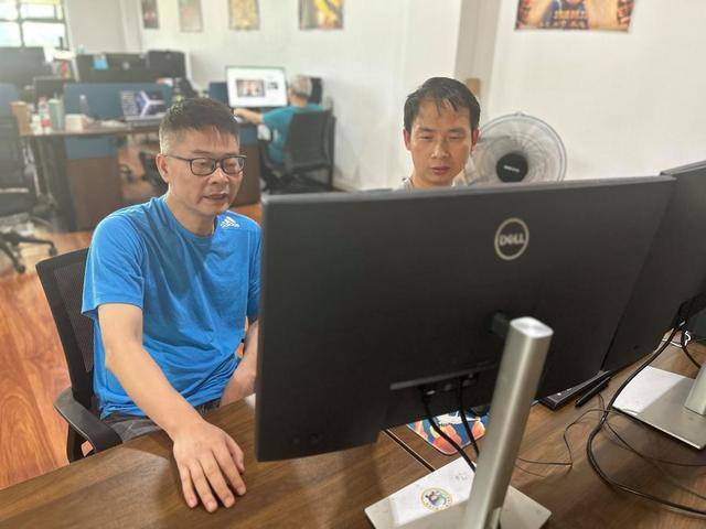 袁中标(着蓝衣者)在指导技术人员修改完善“辛追夫人”3D数字人形象(5月15日摄)。新华社记者 张玉洁摄