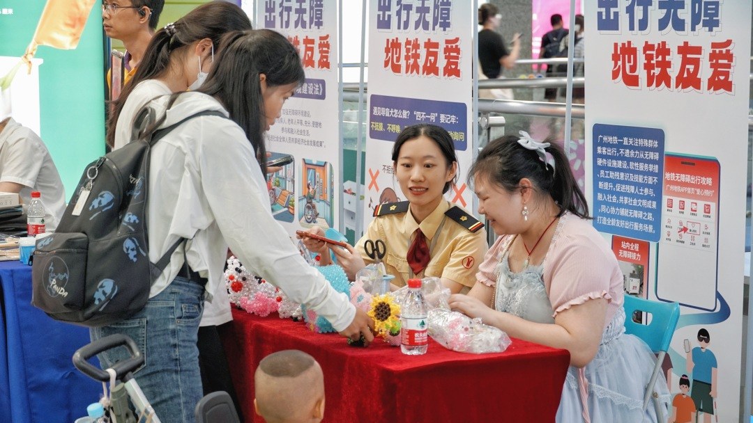 活动当天,4名残障人士代表在地铁工作人员的陪同下,在体育西路和林和西两个站点间往返体验地铁无障碍出行服务。现场还摆放了助残知识展架,并由视障人士现场手工编织串珠作品义卖,吸引不少市民乘客上前咨询和交流。
