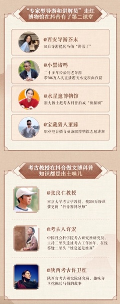 一批专家型导游和讲解员在抖音走红,进一步打通了文博专业领域和普通公众之间的专业壁垒,令网络成为第二课堂,也进一步带动了博物馆热的升温。95后导游@西安导游芥末,通过生动、细致的讲解把兵马俑讲“活”了,在抖音收获超过426万粉丝。从业二十多年的老导游@小黑诸鸣,在甘肃天水麻辣烫走红后,他领着506万人次直播“云游”麦积山石窟和天水市博物馆,挖掘天水美食背后的8000年历史。浙大考古学博士@水星逛博物馆,几年来带网友体验小众博物馆,不少小众馆因她的短视频需蹲点抢票才能预约到门票。南京大学历史学院考古学教授张良仁,在抖音分享美食背后的历史知识,成为被200万粉丝催更的“抖音赛博导师”。