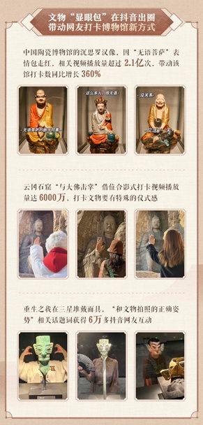 由中国文物信息咨询中心指导,抖音发布的此份报告显示,随着越来越多人被博物馆和文物短视频“种草”,“了解一座城市,从博物馆开始”成为被广泛接受的社会认知,“为博物馆奔赴一座城”成为年轻人出游新现象。