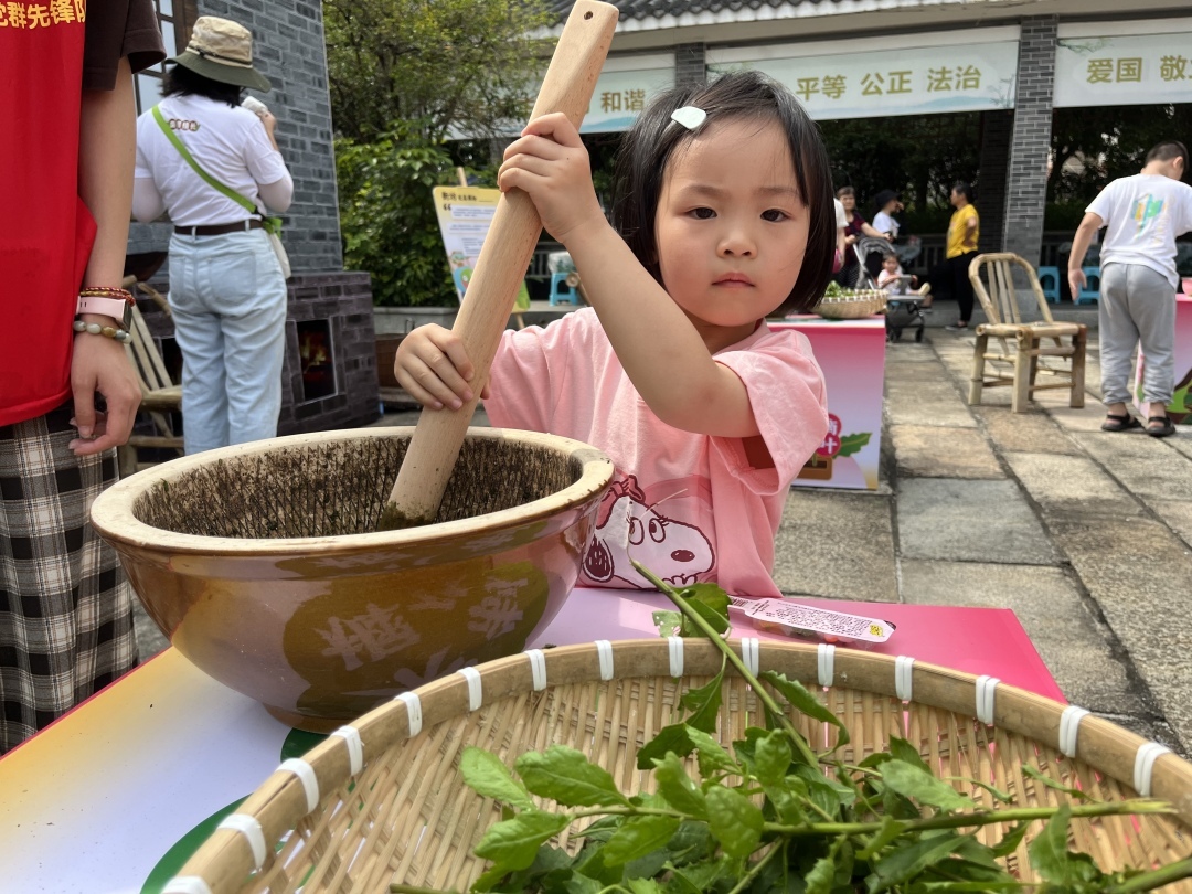 在活动现场的在非遗技艺体验环节,游客们在村民导师的指导下,亲身体验了摘叶、磨汁、磨米浆等传统制作步骤,深入了解“九层栾樨粉”制作技艺。此外,作为近两届文化节新增体验环节,“栾樨泼水洗礼”还成为了夏日里的一抹清凉。现场,游客们在泼水的欢笑中洗去了旧岁的不顺,迎接未来的吉祥与幸福。