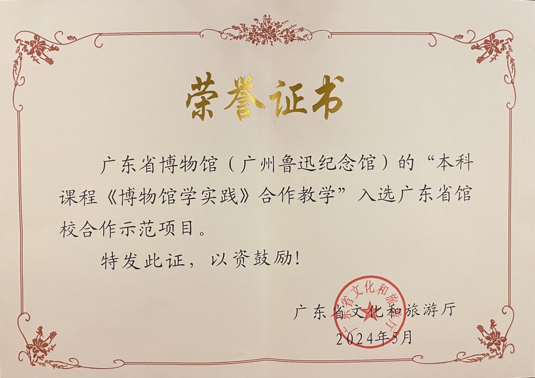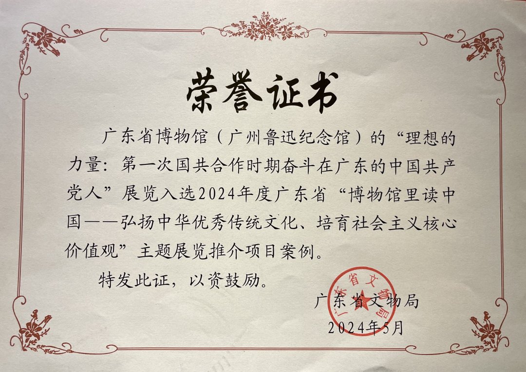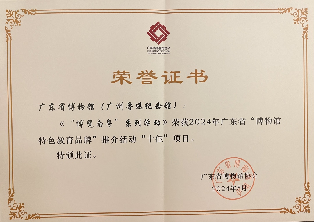 “定义时间——清代广钟精品展”“理想的力量:第一次国共合作时期奋斗在广东的中国共产党人”获评2024年度广东省“博物馆里读中国——弘扬中华优秀传统文化、培育社会主义核心价值观”主题展览推介项目。广东省博物馆讲解员全丽静、卢春凌在首届“博协杯”博物馆讲解员大赛广东赛区选拔赛中,分别获专业组和志愿组一等奖。粤博与中山大学社会学与人类学学院合作的本科课程《博物馆学实践》、教育项目《鞋盒里的博物馆——广东省中小学生设计作品征集大赛》获评2024年广东省馆校合作示范项目。《“博览南粤”系列活动》在2024年广东省“博物馆特色教育品牌”推介活动中入选“十佳”项目。数字文创体验服务项目在第七届(2022-2023年度)广东博物馆开放服务最佳做法推介活动中,获“最佳文创产品推广”奖。
