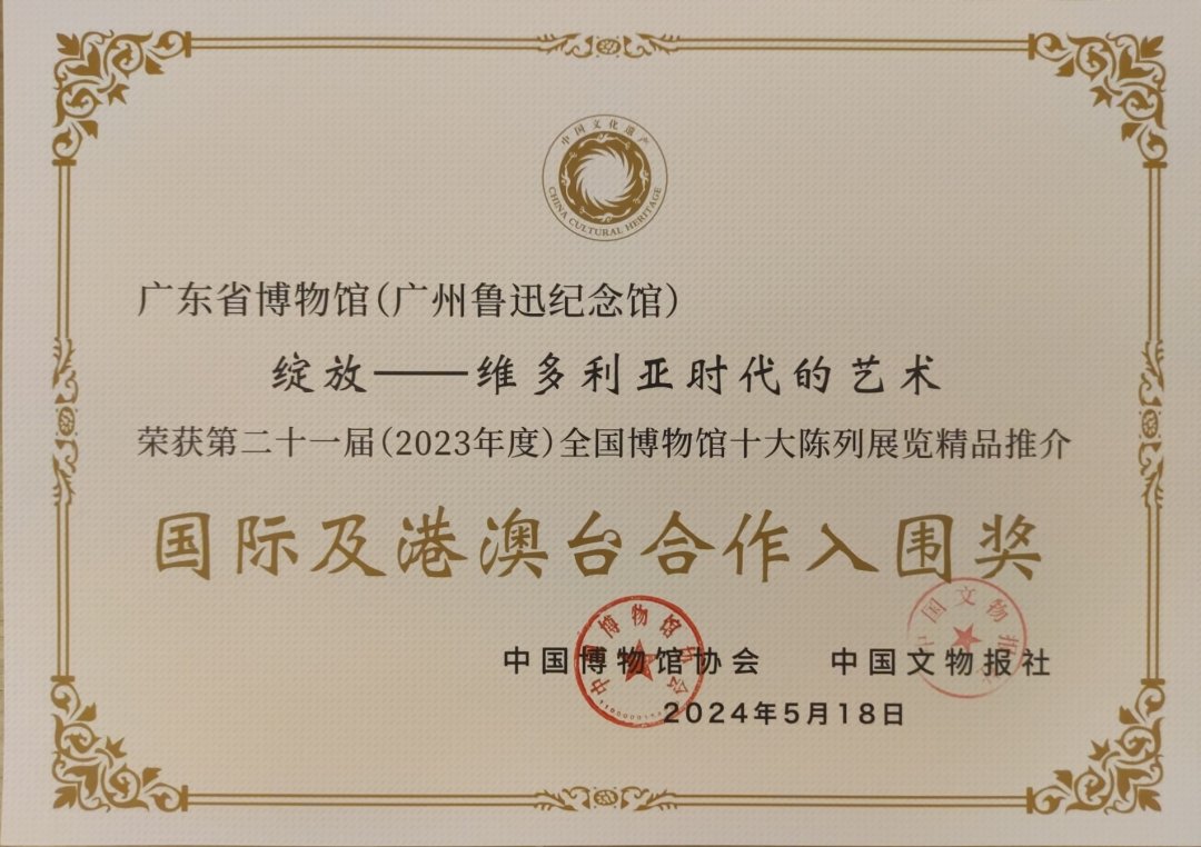 5月18日,由国家文物局、陕西省人民政府主办,陕西文物局、西安市人民政府、中国博物馆协会、中国文物报社承办的第二十一届(2023年度)全国博物馆十大陈列展览精品推介活动揭晓终评结果,“绽放:维多利亚时代的艺术”展览获“国际及港澳台合作入围奖”。广东省博物馆连续11年获全国博物馆十大陈列精品相关奖项,继续保持连续获奖最长的纪录。