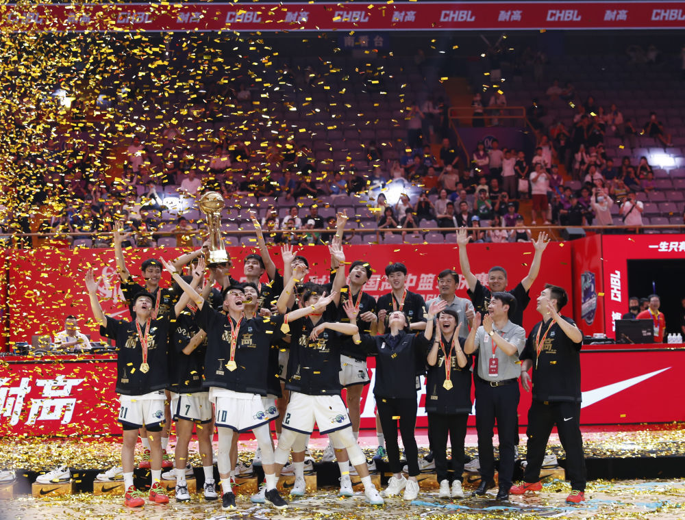 5月19日,湖南地质中学队球员古城安(左一)、王磊(右一)庆祝夺冠。新华社记者 雒圆 摄