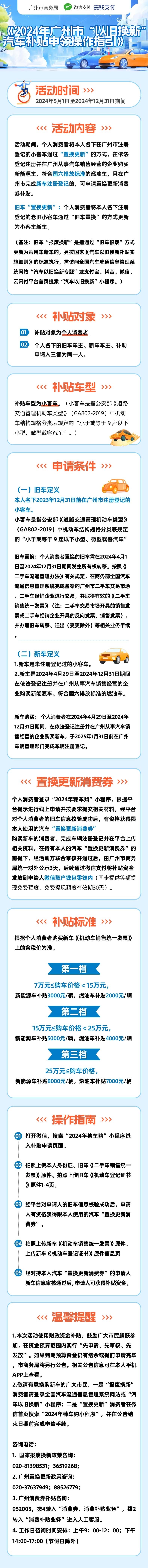 为贯彻落实国家推动大规模设备更新和消费品以旧换新等文件精神,紧抓国家鼓励推进消费品以旧换新决策机遇,鼓励消费者将老旧汽车通过报废和置换方式更新为新车,促进广州市汽车梯次消费、更新消费,推动汽车产业的绿色化、智能化发展。广州市商务局结合广州汽车消费工作实际,于5月1日起全面推动开展新一轮汽车以旧换新促进汽车更新消费活动。