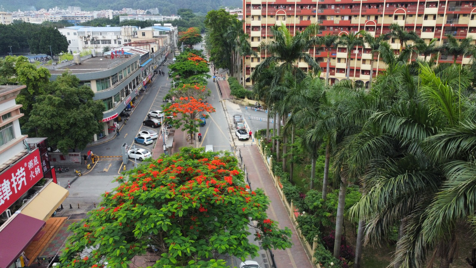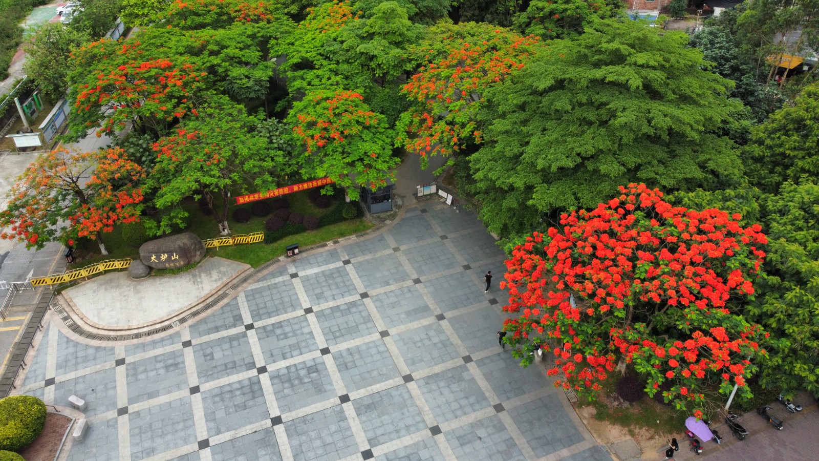 初夏时节,凤凰街辖内绿树成荫。位于火炉山森林公园北门广场的凤凰花正竞相怒放,朵朵红色的小花挂满枝头。(摄影:喻意良)