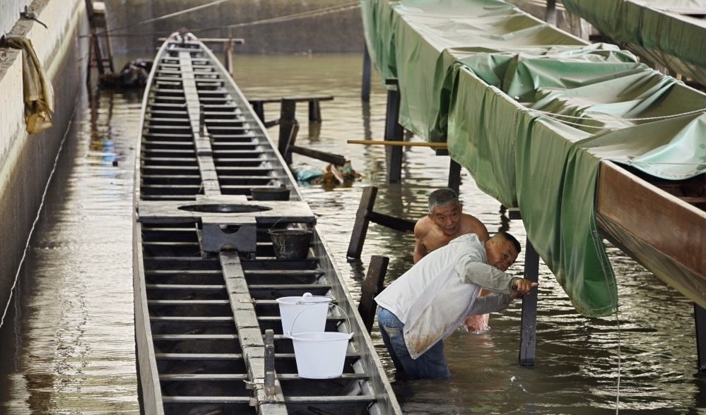 当天上午9点左右,记者在莲湖生态公园岸边的龙船坞看到,多位村民在耐心等待龙船坞内的水排出,沉睡一年的两条龙船逐渐现身。接着,大家一起掏船舱泥沙、舀船底泥浆,撸起袖子擦洗龙舟。
