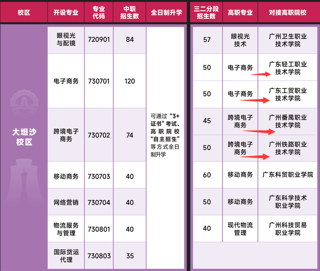 其中,和广州市财经商贸职业学校中高职贯通培养三二分段合作高校就包括广州番禺职业技术学院、广东轻工职业技术学院、广州铁路职业技术学院、广东科学技术职业学院、广东农工商职业技术学院等等知名高职院校。让同学们的升学路更有保障。