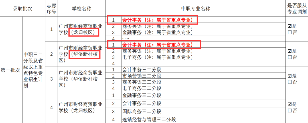 PS:不同学校的省重点专业范围都会有所不同。例如会计事务专业,在广州市财经商贸职业学校是属于省重点专业,但有可能在其他学校就没列入省重点专业行列。所以大家报考的时候要看清楚学校的招生计划表,以此为准。