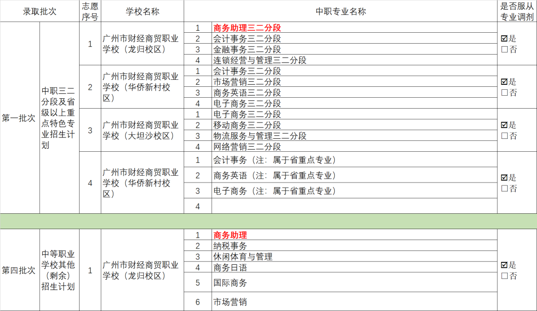 某同学C,希望报考财经商贸的“商务助理”专业三二分段班和中职班。则可以在第一批次志愿1中填写“商务助理三二分段”,然后第四批次的第1志愿中,填写“商务助理”。