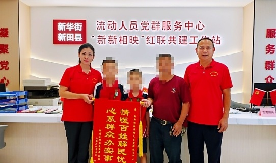 日前,一面写着“心系群众办实事、情暖百姓解民忧”字样的锦旗送到了位于广州市花都区新华街的“新新相映”流动人员党群服务中心,感谢该党群中心为老百姓办好事、办实事,为群众排忧解难。“如果不是党委政府及社会爱心机构的及时帮助,小孩真的上不起学。”郑某庆的叔公握着“新新相映”流动人员党群服务中心党支部书记郑诗华的手激动地说。