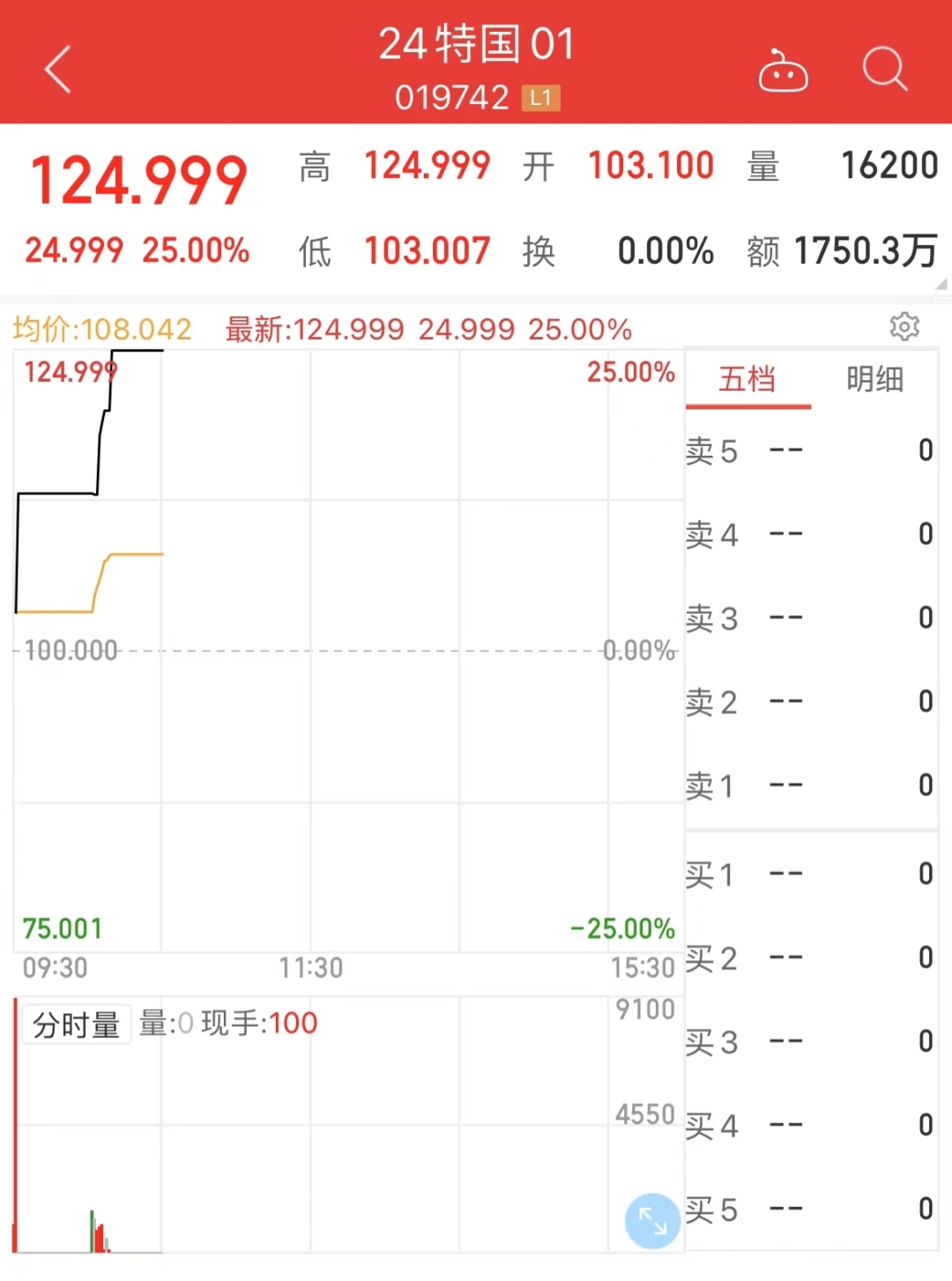 具体来看,“24特国01”在当日开盘后快速拉升,1分钟内涨超13%,触发临时停牌,自当日9时30分开始暂停交易,10时起恢复交易;不过,在当日10时恢复交易后,“24特国01”延续火热涨势,盘中上涨25%,触发二次临时停牌。