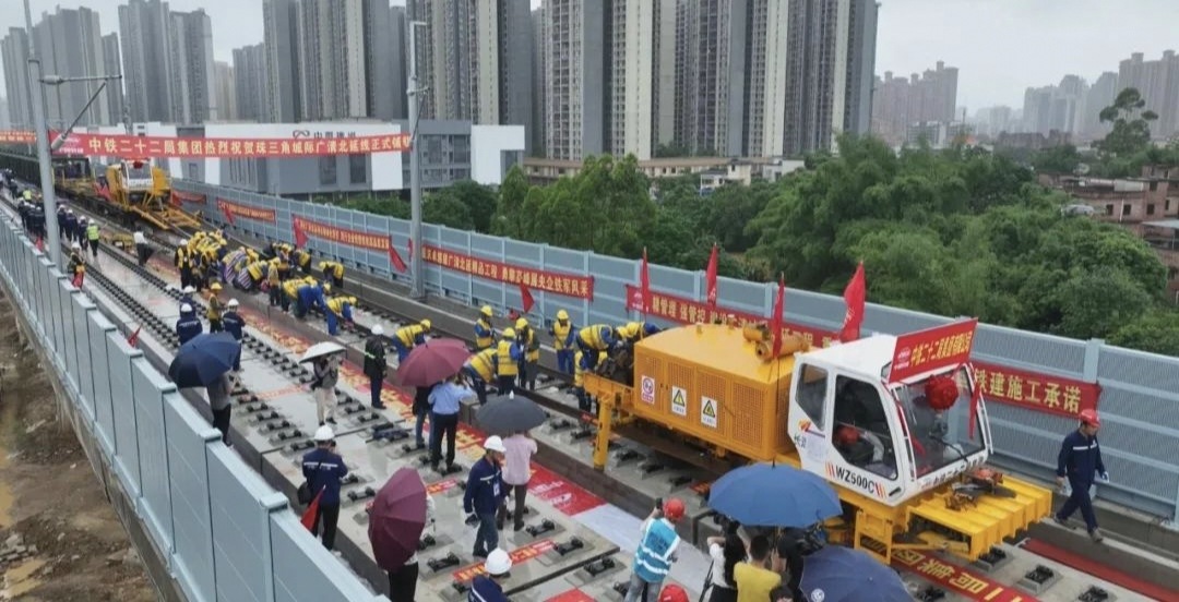 5月21日,珠三角城际广清北延线铺轨仪式在清城站外铺轨现场举行,首对500米长钢轨顺利组装,标志着该项目进入正式铺轨阶段。
