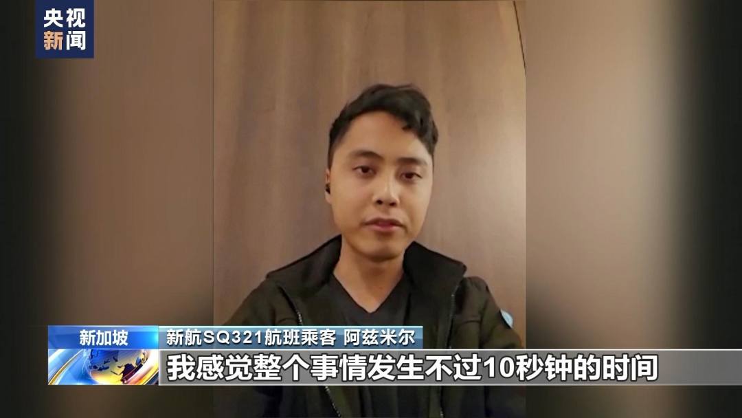 新航SQ321航班乘客 阿兹米尔:我感觉整个事情发生不过10秒钟的时间,实在是太快了,所以所有人都没有反应过来。我当时正坐在座位上休息,不过我系了安全带,突然感觉整个飞机遭遇某种气流,飞机开始摇晃。
