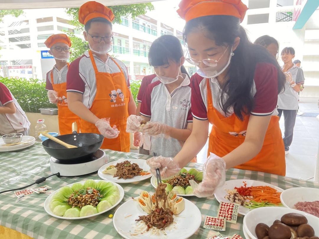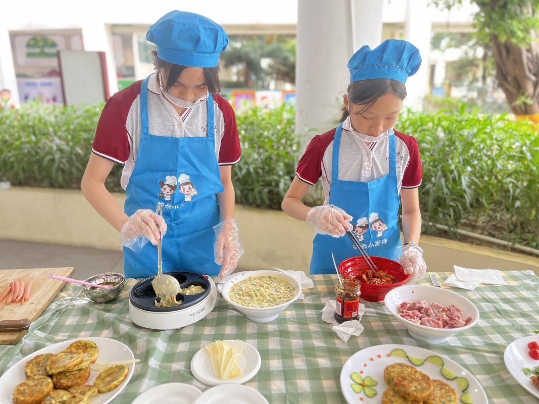 四年级的同学们展示凉拌菜;五年级学生则开起炉子炒菜;六年级学生展示的厨艺项目难度更高,均为美味煎饼或营养蒸菜。