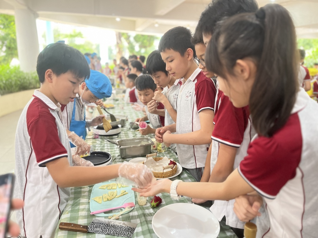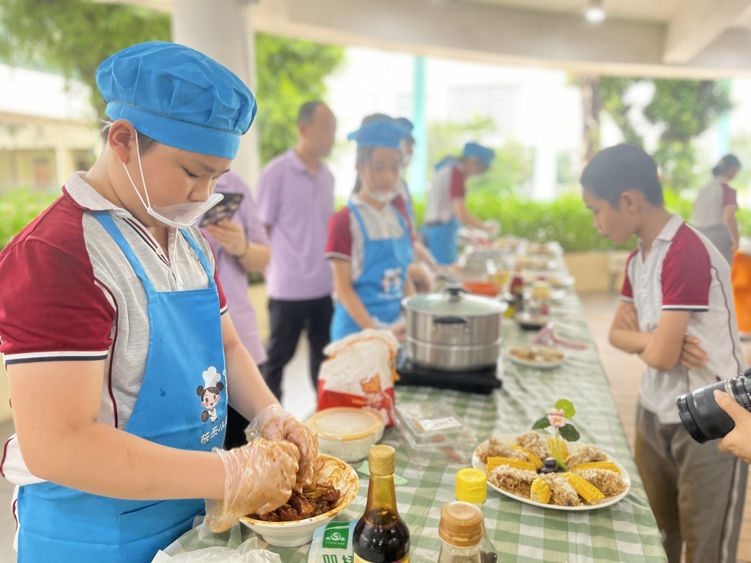 “太美味了!再来一份!”5月21日,广州市为明学校举行第十届小学部生活技能大赛之厨艺大比拼,来自一到六年级的“为明小厨神”同台展示秀厨艺,凉拌菜、家常小炒、水果奶昔等美食信手拈来,还吸引了不同年级的学生前来围观。煎饼一出炉,便被“小吃货”们一抢而空,大受欢迎。
