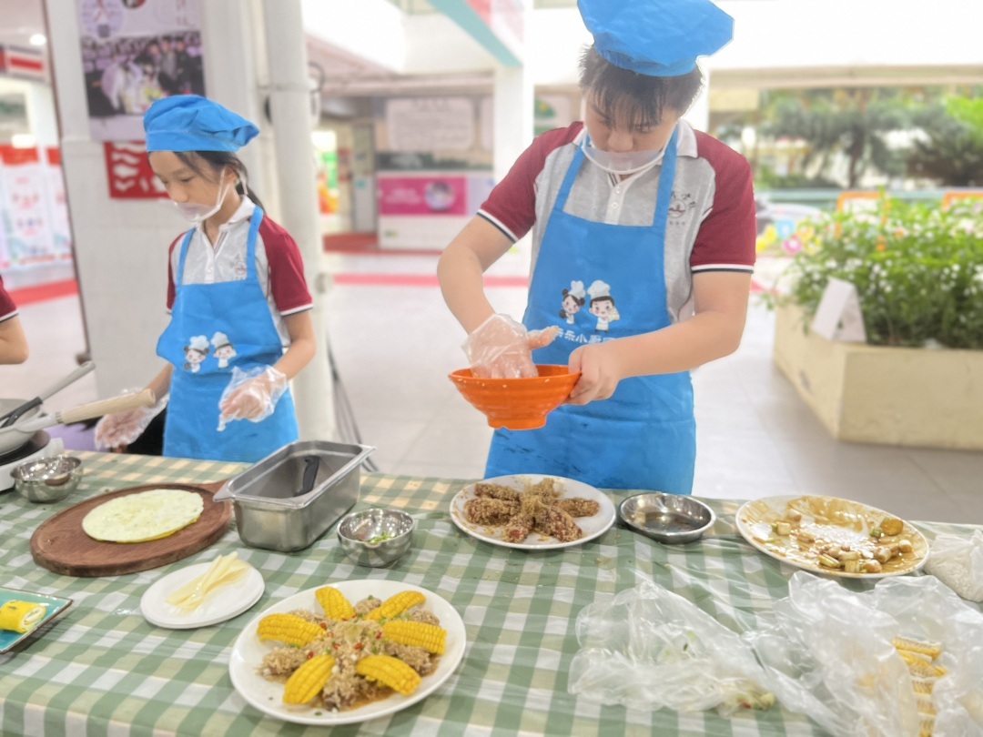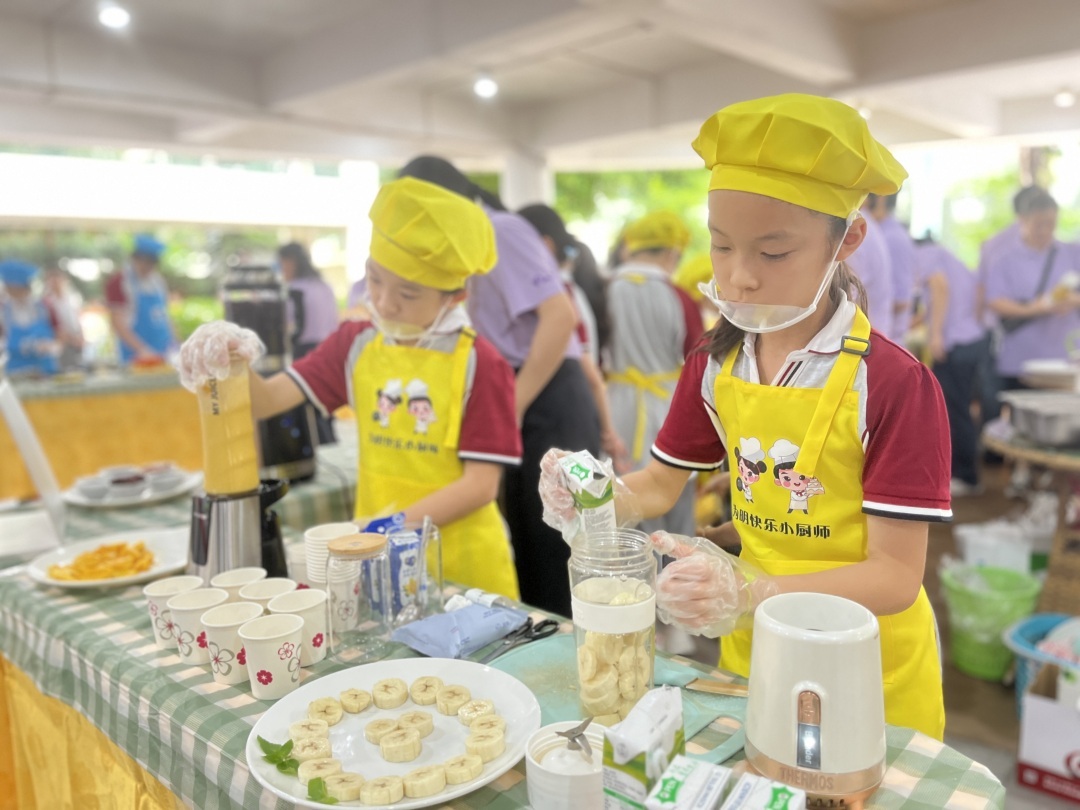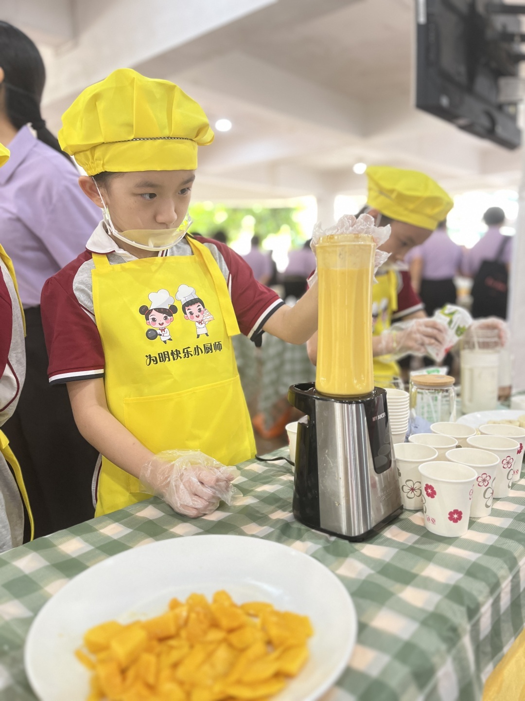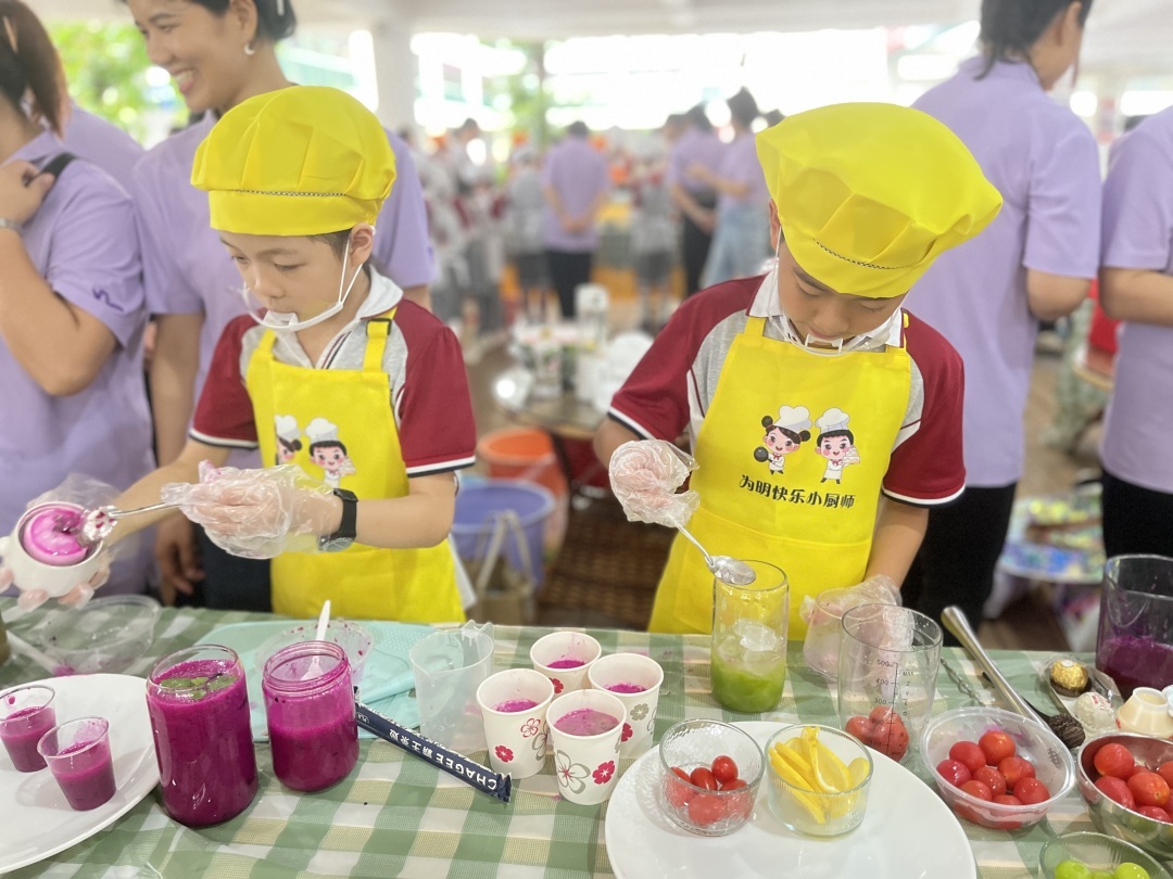 一年级的同学们,有的展示洗菜,有的负责捏丸子;二年级学生的主打菜式为美味饭团;三年级的同学们用榨汁机做出芒果奥利奥奶昔、五谷杂粮饮等甜品饮料。