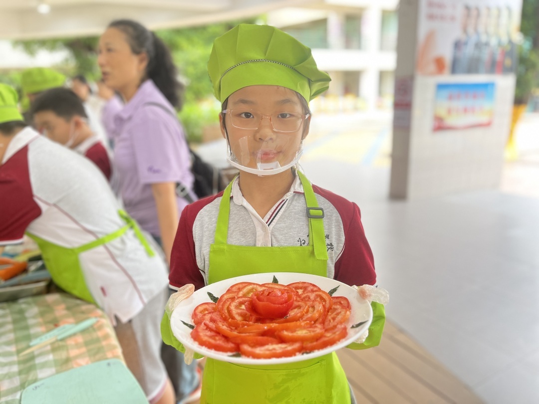 四年级的倪汐妍同学做的是一盘番茄凉拌菜,她将番茄切片,摆出精美的鲜花造型,撒上白糖,寓意“花开富贵”。
