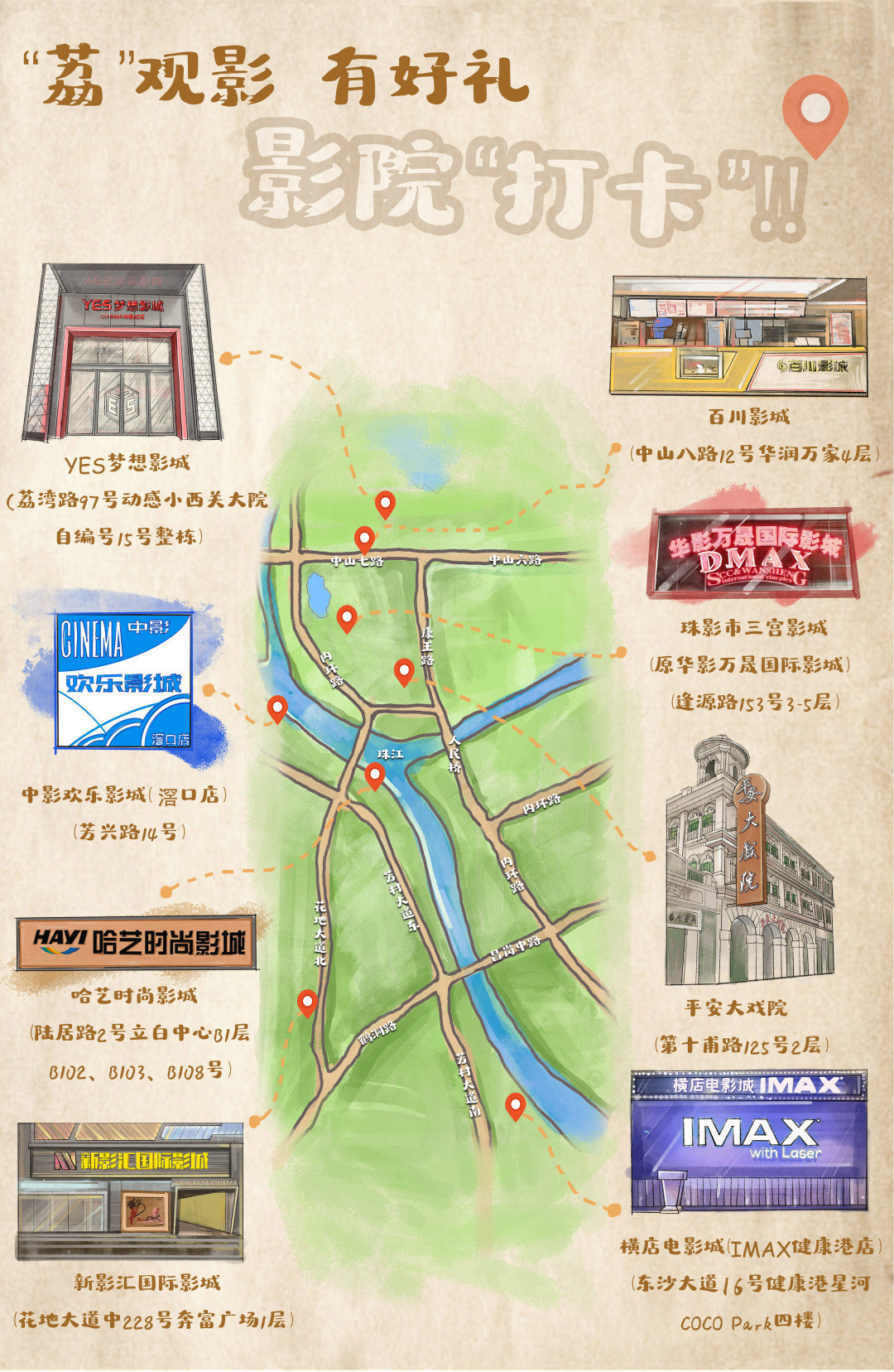 本次活动的盖章卡片是精美的荔湾区观影地图,上面手绘了荔湾河道路网和多家影院建筑,饱含西关风情和乡愁。观众盖上一枚融入影院特色的印章,还可以与朋友共享卡片、合作集章,形成独家的观影记忆。