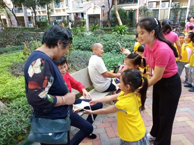 在活动中,大小志愿者们来到紫薇花园周边的商铺和绿化休息区,对周边商铺工作人员和居民进行垃圾分类宣传。在老师指引下,孩子们来到居民面前,举起手中垃圾分类小卡片向大家认真宣传,一声声“垃圾分类,人人有责”的话语得到大家回应和支持。同时,孩子们把自己亲手做的垃圾分类小旗子以及倡议书送给商铺工作人员和居民。