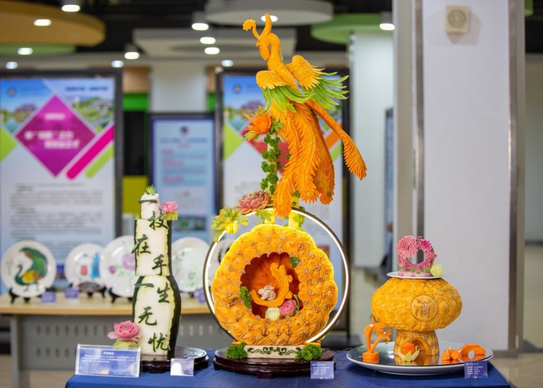 “凤凰合在朝阳下,岭上先传金鼓声。”栩栩如生的凤凰于鼓上展翅翱翔,犹如在迎接新的朝阳。广东创新科技职业学院经管学院的美食雕刻作品《金鼓朝阳》用巧思和技艺将食材变成了一件艺术品,引来阵阵惊叹。