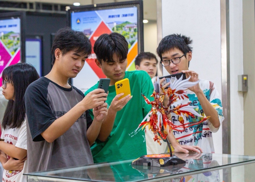 在该校图书馆的活动现场,展示了师生制作的100余件技能作品,每一件都散发着独特的魅力和灵感。整个场馆分为六大展区,陈列展示机械装置、雕塑、书法、绘画、面塑、动漫、服装设计、工艺制造、文创等不同专业领域的作品。
