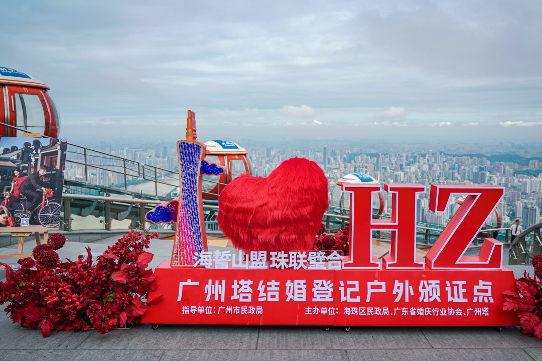 广州塔是广州的地标性建筑,以其600米的高度俯瞰全城。此前,广州塔及其旗下的景点景区精心策划了浪漫告白、婚纱摄影、高端喜宴等特色服务。如今,广州塔婚登户外颁证点的启用,为新人们提供了一个将城市天际线作为爱情背景的浪漫颁证场景。据海珠区民政局透露,该婚登颁证点为全国最高的结婚登记户外颁证点。