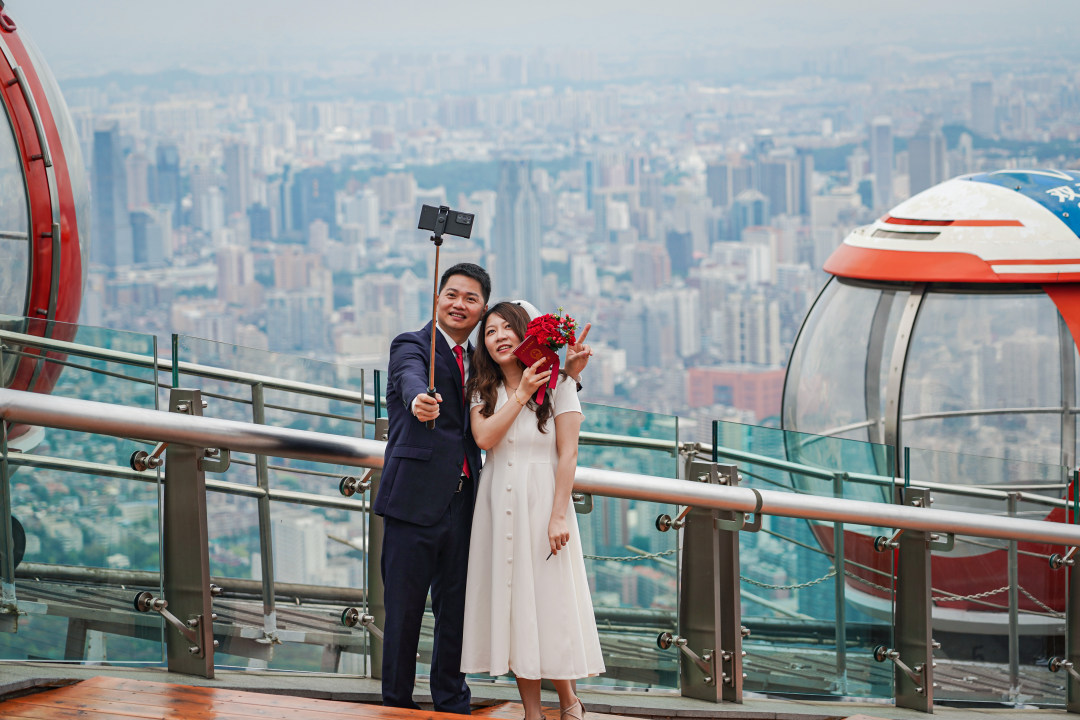5月22日,在450米的高空之上,以城市天际线为背景,一对新人在广州塔结婚登记户外颁证点许下爱的誓言。在广州的地标性建筑上领取结婚证,让整座城市见证自己的幸福,这样新奇的领证方式火了!
