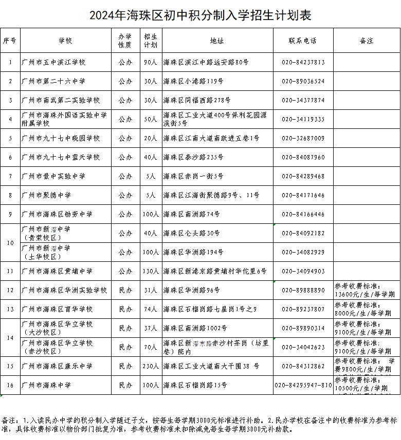 初中方面,景中实验中学、五中滨江学校等11所公办中学有初中积分制入学招生计划,康乐中学、海珠中学等5所民办学校有初中积分制入学招生计划。