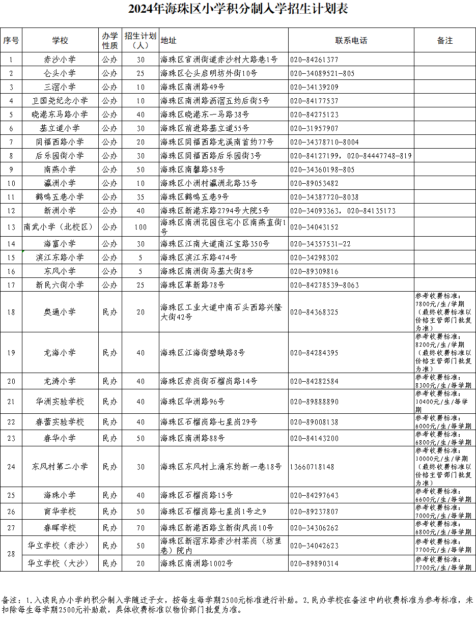 招生计划表显示,小学方面,海珠区滨江东路小学、同福西路小学、新民六街小学等17所公办小学有积分制入学招生计划,龙涛小学、春华小学、海珠小学11所民办学校有小学积分制入学招生计划。