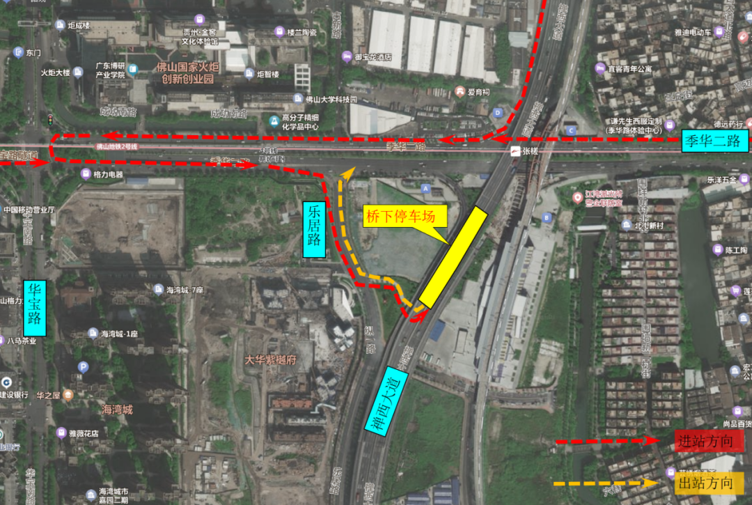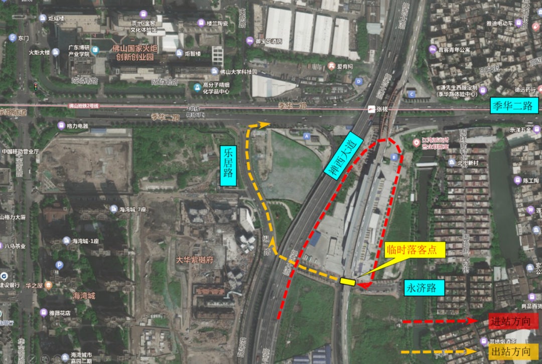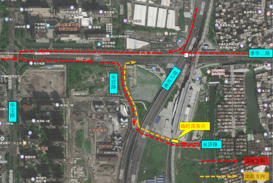 1、从季华路方向前往城际张槎站。具体路线是:季华二路——乐居路——永济路——调头进入临时落客点下车进站。