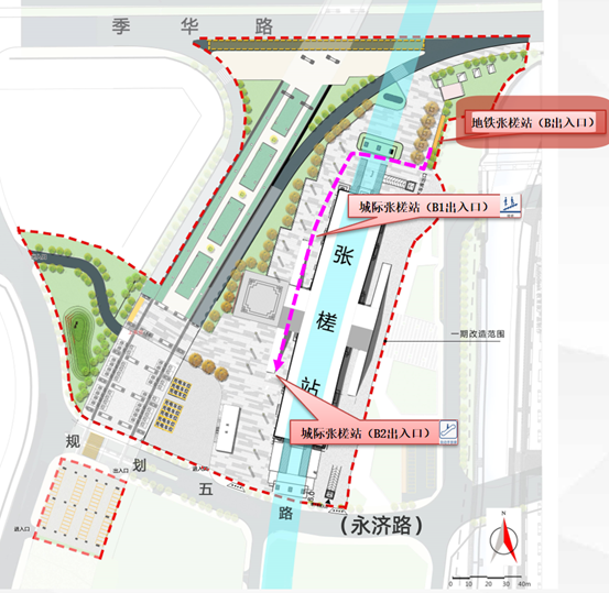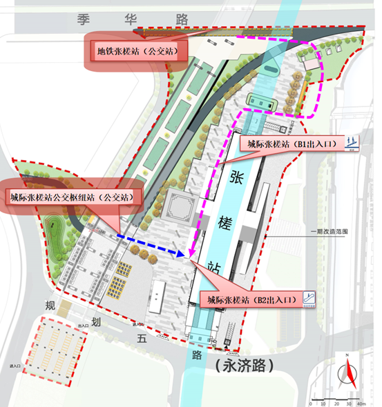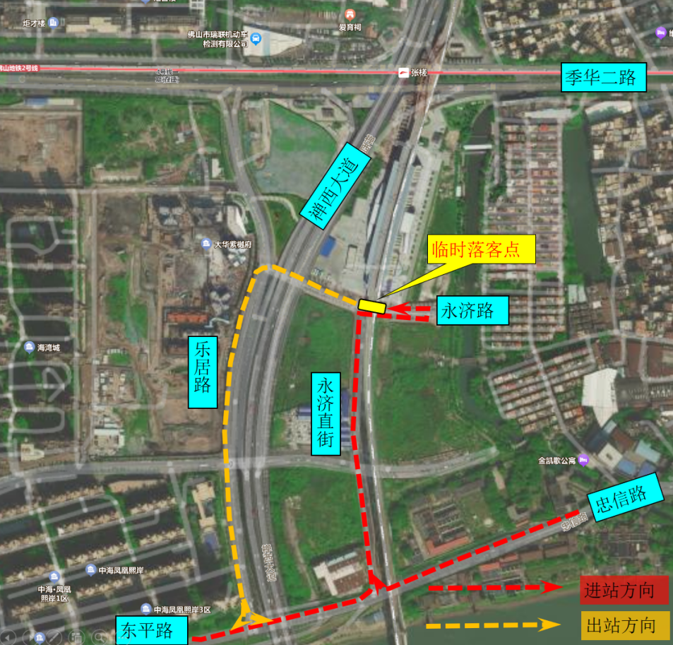 2、从禅西大道(南往北方向)前往城际张槎站。具体路线是:禅西大道(“季华路/南庄”出口)——右转进入送客通道——沿东广场消防通道右转进入永济路临时落客点下车进站。