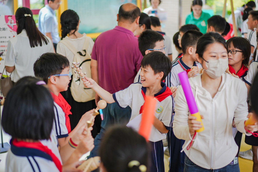 在硬核科技以外,“玩掉烦恼,玩出快乐”音乐心理乐园摊位选择将音乐与情绪关联起来,引导青少年以音乐为桥梁,了解和释放情绪。学生在现场使用三角铁、铃鼓、沙锤等多种乐器,跟随音乐节奏进行即兴演奏,在音乐氛围中增加了对自身情绪的认识。