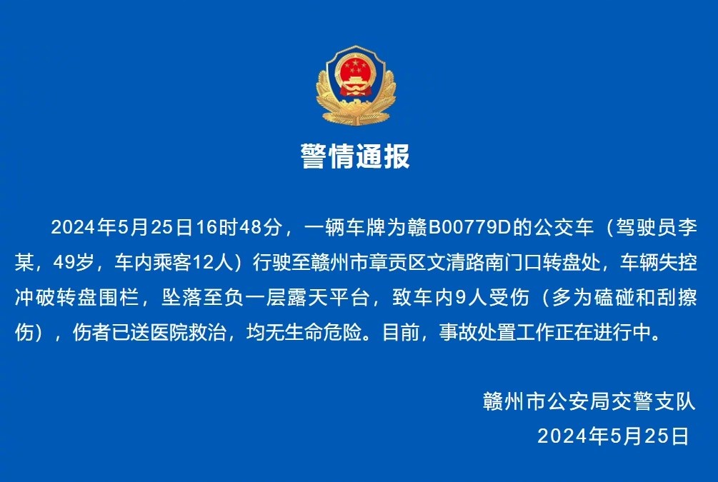 赣州市公安局交警支队发布警情通报,2024年5月25日16时48分,一辆车牌为赣B00779D的公交车(驾驶员李某,49岁,车内乘客12人)行驶至赣州市章贡区文清路南门口转盘处,车辆失控冲破转盘围栏,坠落至负一层露天平台,致车内9人受伤(多为磕碰和刮擦伤)。伤者已送医院救治,均无生命危险。目前,事故处置工作正在进行中。